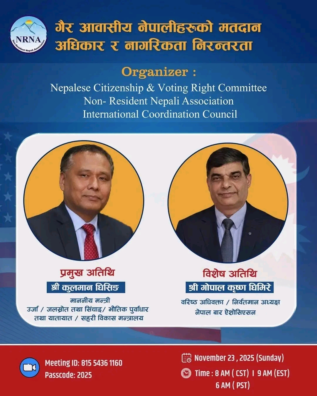 गैरआवासीय नेपाली संघ अन्तर्राष्ट्रिय समन्वय परिषद् अन्तर्गतको “नेपाली नागरिकता निरन्तरता र मतदान अधिकार समिति”को पहिलो बैठक हिजो Zoom मार्फत सम्पन्न भयो। बैठकमा उपस्थित सबैले आफ्ना...