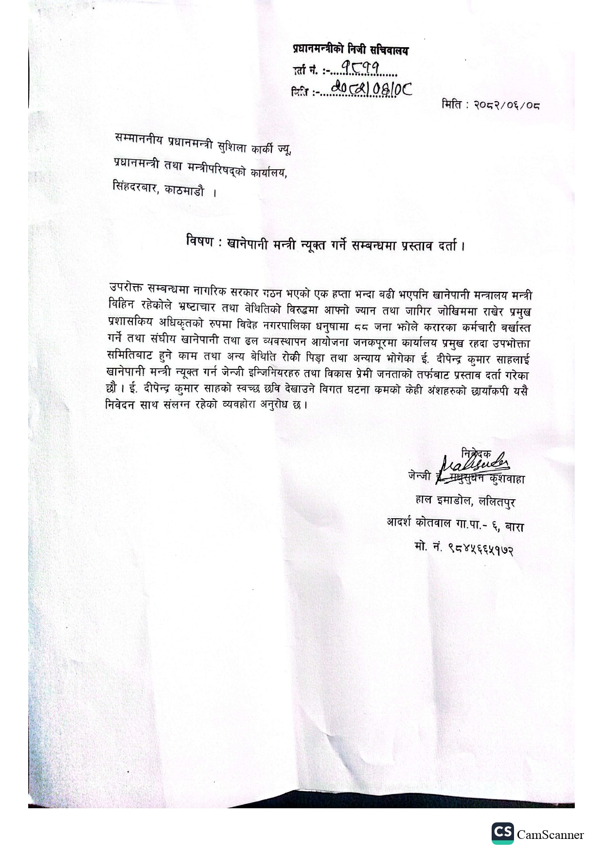 जनकपुरधाम। जेनजी समूहका तर्फबाट ई. मधुसुधन कुशवाहाले प्रधानमन्त्री सुशिला कार्कीलाई सम्बोधन गर्दै खानेपानी मन्त्रालयमा ई. दिपेन्द्र साहलाई नियुक्त गर्न प्रस्ताव दर्ता गराएका छन्।