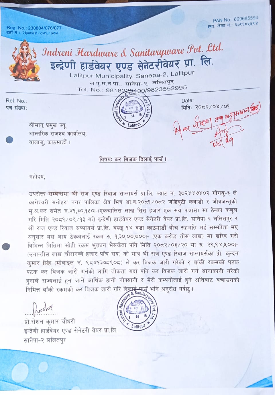 उक्त विषयमा इन्द्रेणी हाडर्वयर एण्ड सेनेटरीवेयर ले आन्तरिक राजस्व कार्यालय, बालाजुमा आधिकारिक निवेदन दर्ता गराए पनि, कार्यालयले आवश्यक प्रक्रियागत कदम अगाडि नबढाएको गुनासो उजुरीकर्ताले गरेका छन्।
