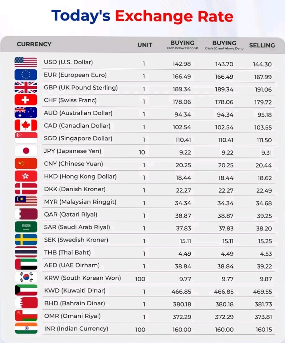 काठमाडौं। आज विदेशी मुद्राको विनिमयदर निर्धारण गरेको मुल्यमा अमेरिकी डलरको मूल्य हालसम्मकै उच्च बिन्दुमा पुगेको छ । निर्धारित विनिमयदर अनुसार अमेरिकी डलर एकको खरिददर १४३ रुपैयाँ ५० पैसा र बिक्रीदर १४४ रुपैयाँ १० पैसा निर्धारण गरिएको छ ।