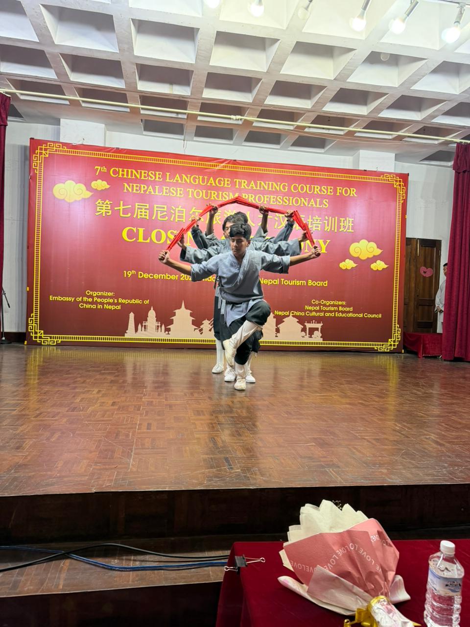 The closing ceremony was graced by the presence of key dignitaries, including His Excellency Zhou Pan, Deputy Chief of Mission (DCM) at the Chinese Embassy, Mr. Ram Krishna Lamichane, Director General of the Department of Tourism, and Mr. Hikmat Singh Ayer, Officiating CEO of the Nepal Tourism Board. The event featured a certificate distribution ceremony, honoring the graduates of the 7th batch of Chinese language students.