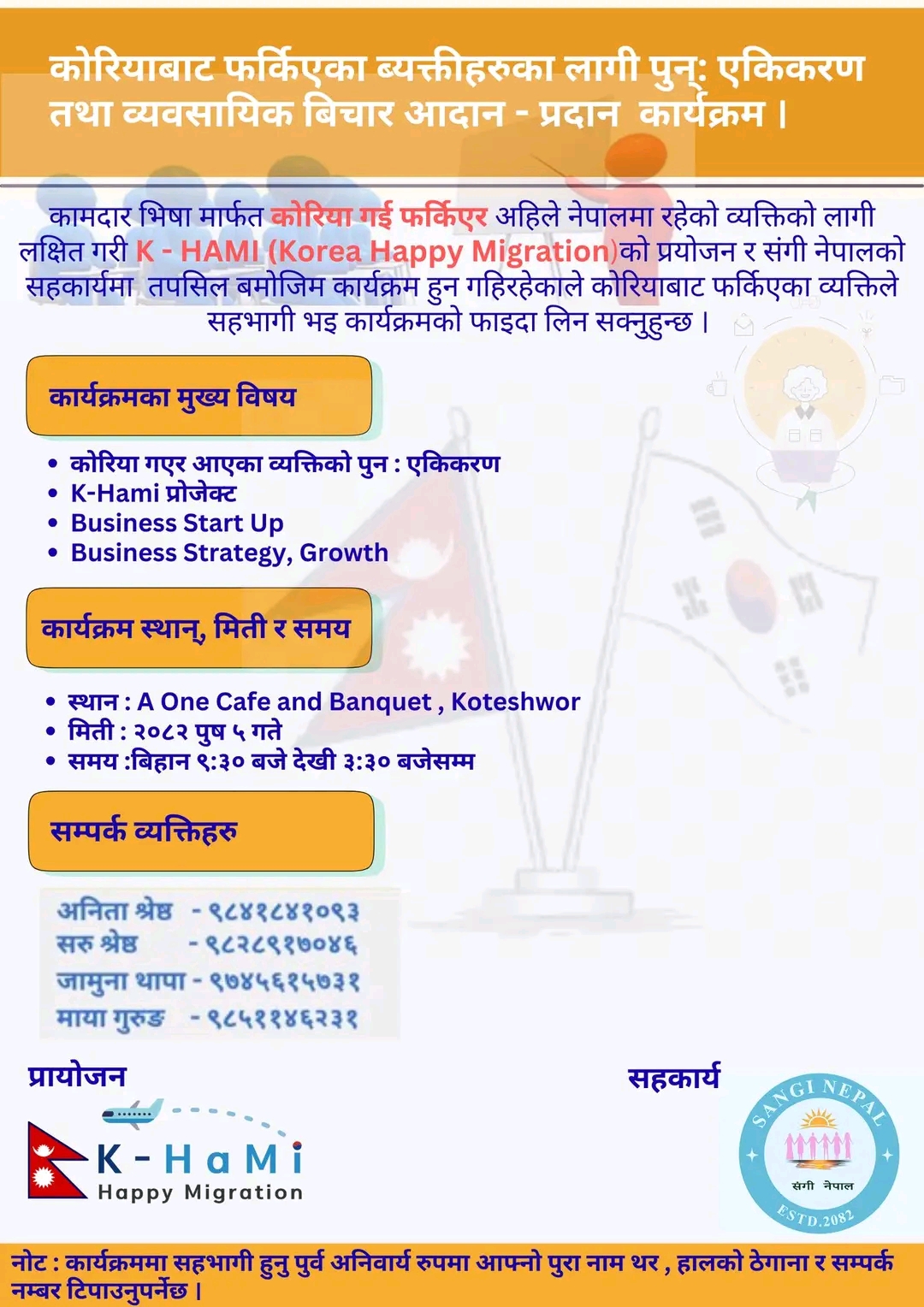 पाैष ०५ गते शनिबार, KOICA नेपाल र K_HaMi Project को प्रायोजन तथा संगी नेपालको आयोजनामा उक्त कार्यक्रम सम्पन्न भएको हो। कार्यक्रममा कोरियाबाट फर्किएका पूर्वकामदारहरूबीच आपसी सहकार्य, अनुभव आदान–प्रदान र उद्योग–व्यवसायमा जोडिने अवसरबारे छलफल गरिएको थियो।