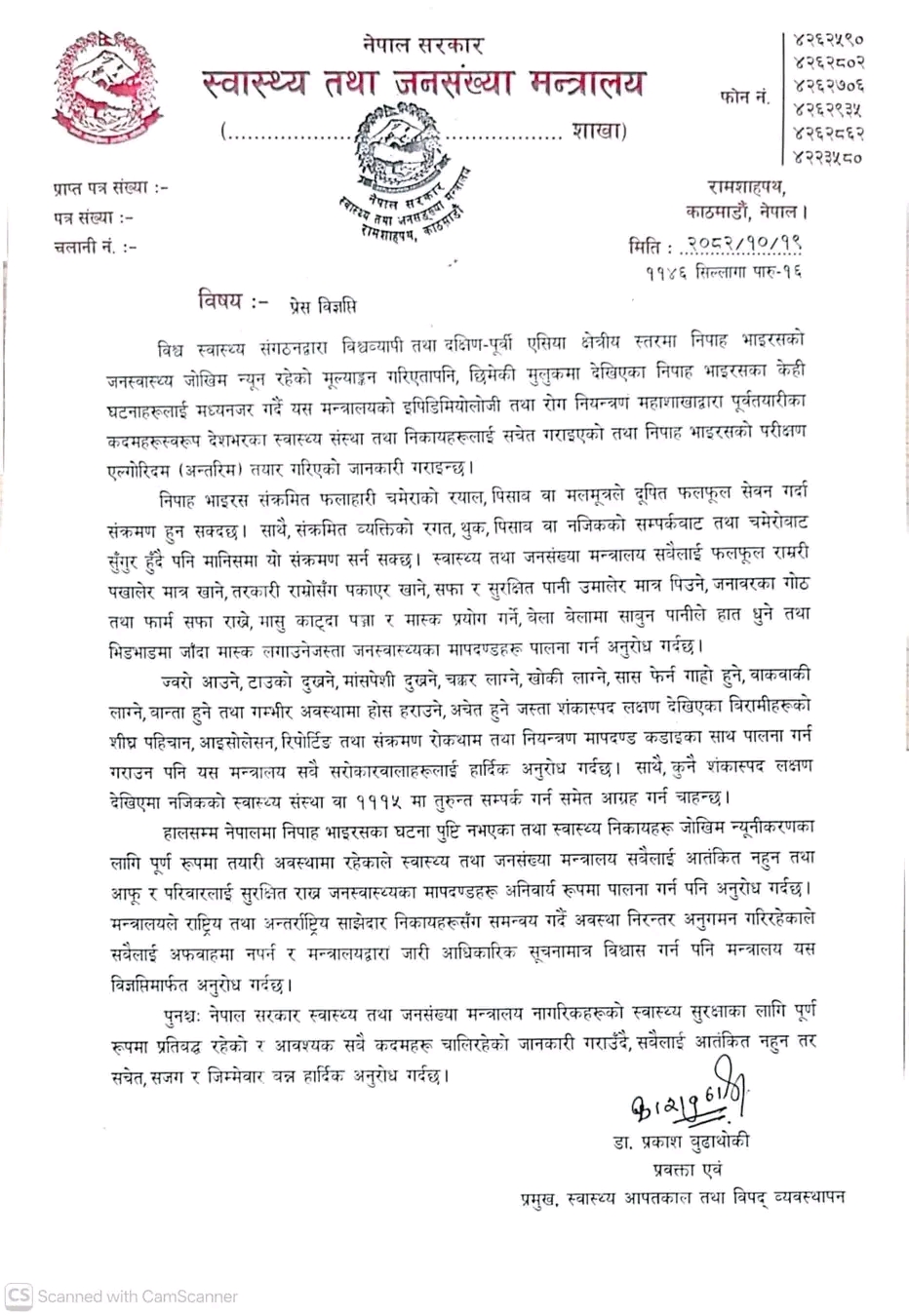 मन्त्रालयले निपाह भाइरससम्बन्धी अवस्थाको निरन्तर अनुगमन गरिरहेको र आवश्यक परे थप तयारी तथा कदम चालिने स्पष्ट पारेको छ।