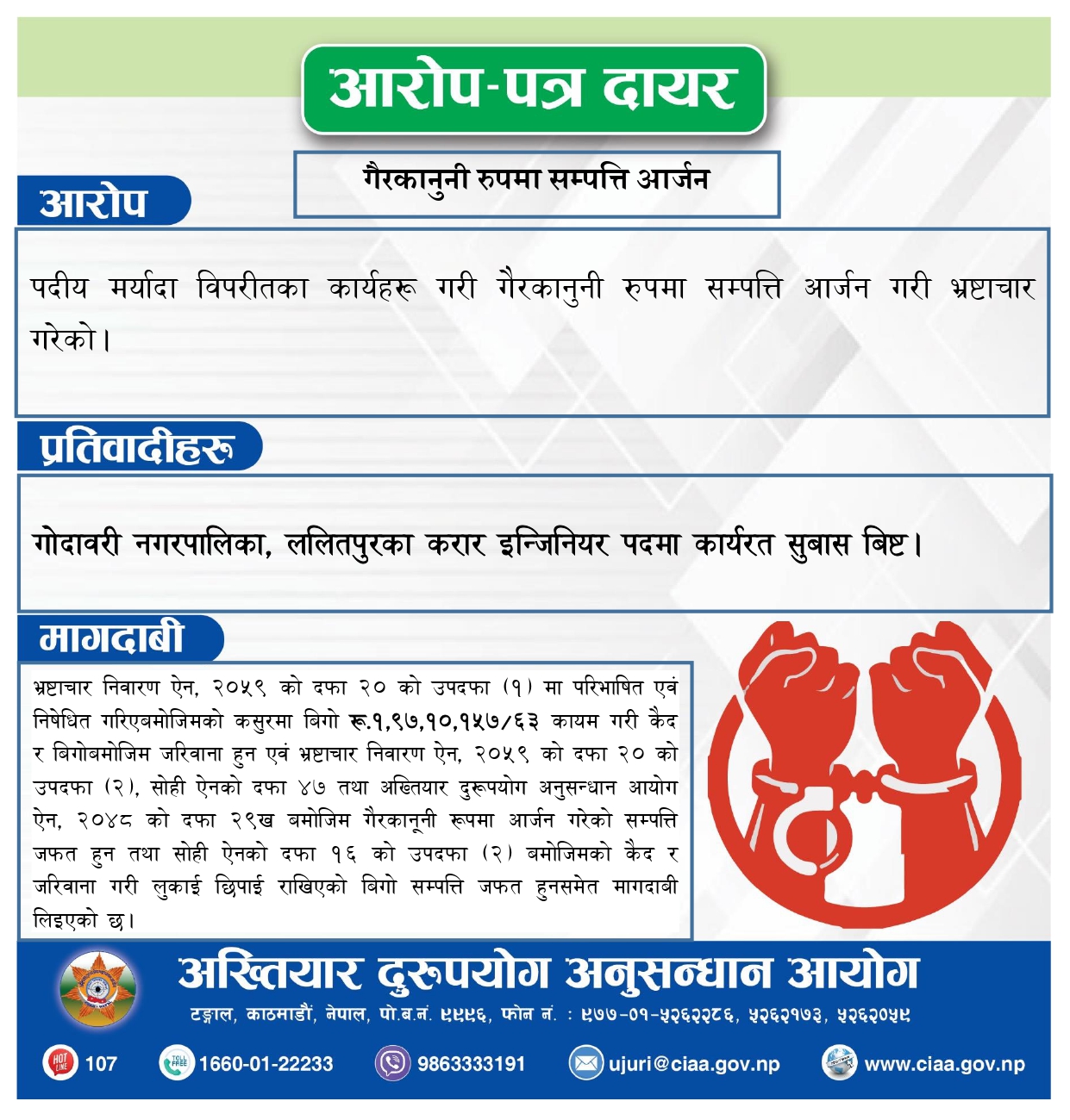 अख्तियार दुरुपयोग अनुसन्धान आयोग (CIAA) ले ललितपुर, गोदावरी नगरपालिकामा करार सेवामा कार्यरत इन्जिनियर सुवास विष्ट विरुद्ध अकुत (अवैध) सम्पत्ति आर्जनको आरोपमा भ्रष्टाचार मुद्दा दायर गरेको छ।