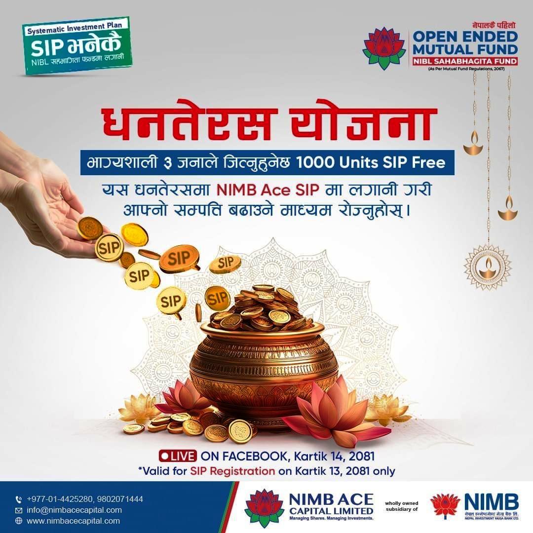 यस योजनामा योग्य हुनका लागि ग्राहकहरुले एनआइएमबि बाट हितग्राही खाता खोली एसआईपी रजिस्ट्रेशन गर्नुपर्नेछ । कार्तिक १३ गते अर्थात धनतेरसका दिनमा मात्रै आफ्नो पहिलो किस्ता तिर्नुपर्नेछ ।