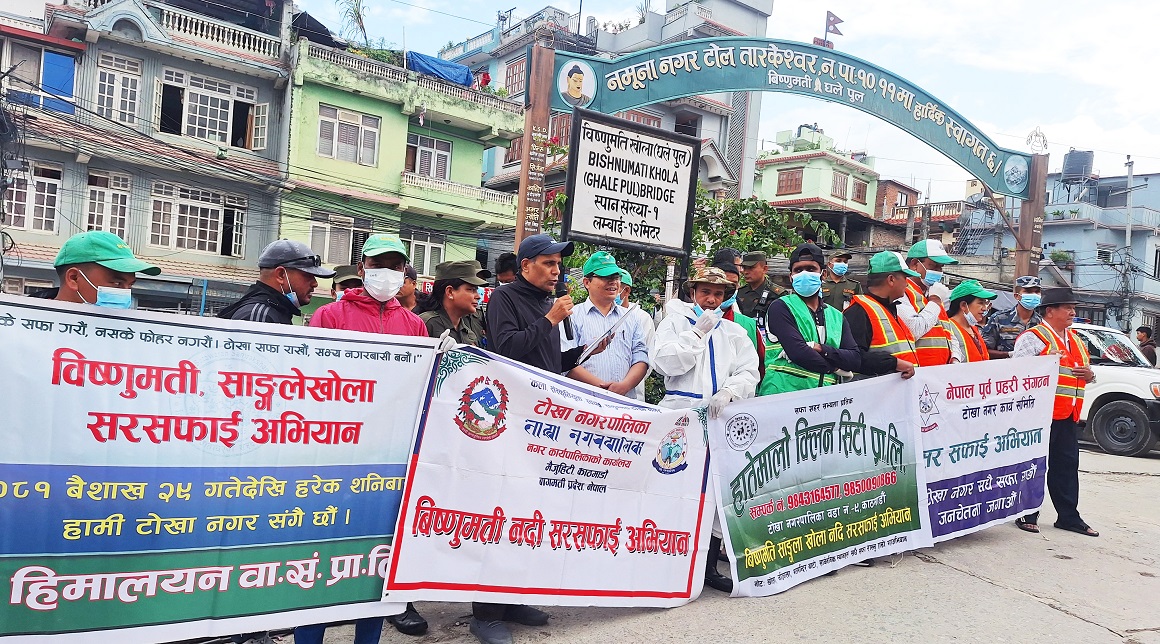 काठमाडौं। टोखा नगरपालिकाले आज ५३ औँ हप्ताको विष्णुमती सफाई अभियान सम्पन्न गरेको छ । टोखा ९ को घले पुलदेखि मनोरथ तिर्थधामसम्मको क्षत्रमा खोला र करिडोर सडक सफा गरेको छ।