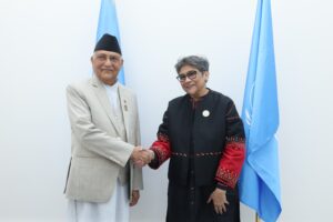 प्रधानमन्त्री केपी शर्मा ओलीसँग संयुक्त राष्ट्रसंघका उपमहासचिव एवं अतिकम विकसित तथा भूपरिवेष्टित विकासशील र साना टापु विकासशील मुलुकका लागि उच्च प्रतिनिधि रबाब फातिमाले आज शिष्टाचार भेट गर्नुभएको छ । भूपरिवेष्टित विकासशील राष्ट्रहरू (एलएलडिसी) को तेस्रो संयुक्त राष्ट्रसङ्घीय सम्मेलनका क्रममा फातिमाले प्रधानमन्त्री ओलीलाई भेट गर्नुभएको हो ।