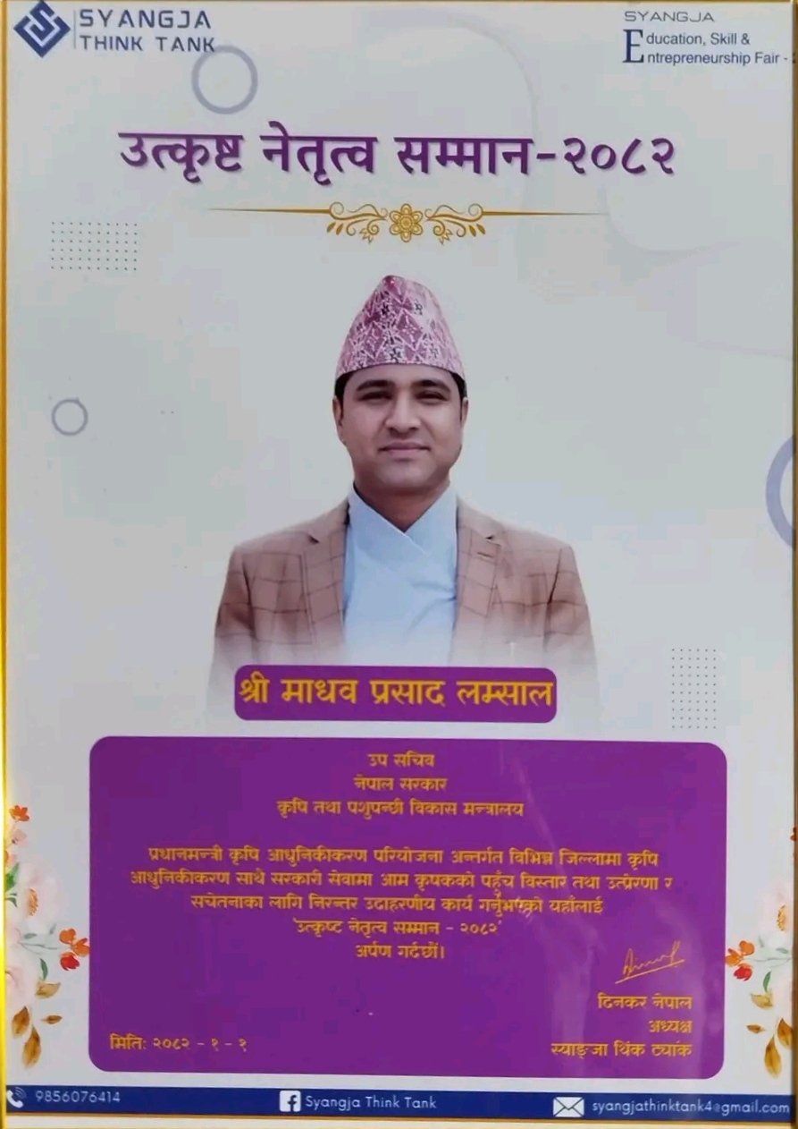 वाग्मती प्रदेश सरकारको कृषि तथा पशुपन्छी विकास मन्त्रालयकाबाट पत्रकार निराज रानाभाट ‘उत्कृष्ट कृषि पत्रकार’ सम्मान