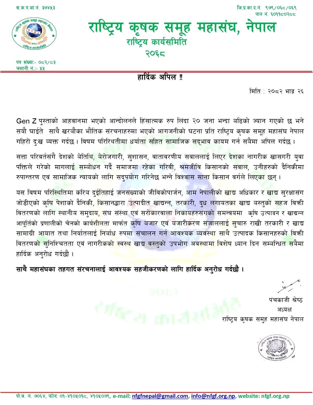 Gen Z पुस्ताको आहवानमा भएको आन्दोलनले हिंसात्मक रुप लिंदा १९ जना भन्दा बढिको ज्यान गएको छ भने सयौ घाईते हुनेगरी भएको घटना प्रति राष्ट्रिय कृषक समूह महासंघ नेपाल गहिरो दुःख व्यक्त गर्दछ। सबै नागरिकले निर्विवाद आफ्नो विचार व्यक्त गर्न पाउने...