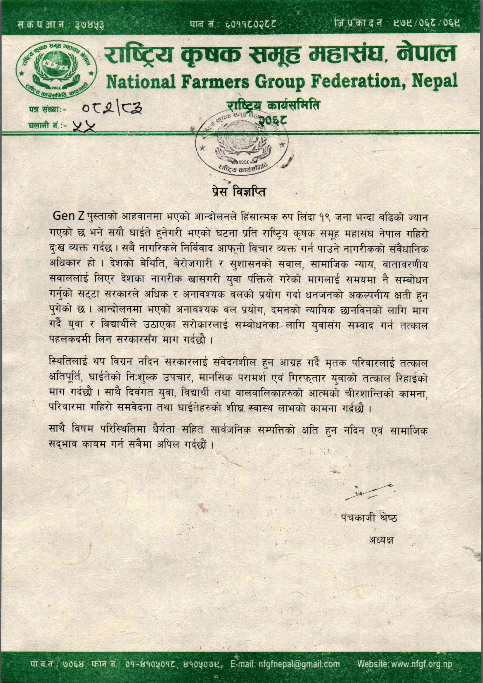 Gen Z पुस्ताको आहवानमा भएको आन्दोलनले हिंसात्मक रुप लिंदा २० जना भन्दा बढिको ज्यान गएको छ भने सयौ घाईते साथै खरबौका भौतिक संरचनाहरुमा भएको आगजनीको घटना प्रति राष्ट्रिय कृषक समूह महासंघ नेपाल गहिरो दुःख व्यक्त गर्दछ । विषम परिस्थितीमा धर्याता...
