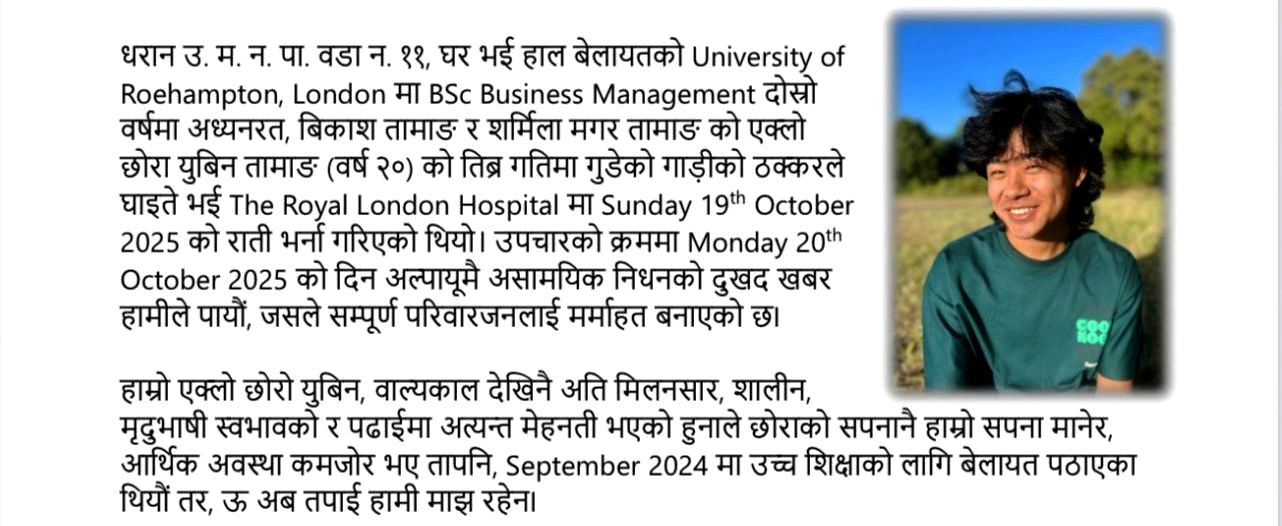 लन्डन, अक्टोबर 29 – बेलायतमा एक दुःखद घटना घटेको छ। धरान उपमहानगरपालिका – ११ का २० वर्षीय नेपाली विद्यार्थी युविन तामाङको कार दुर्घटनामा निधन भएको छ। उनी अध्ययनका लागि करिब एक वर्षअघि बेलायत आएका थिए र युनिभर्सिटी अफ रोह्याम्पटन, लन्डनमा...