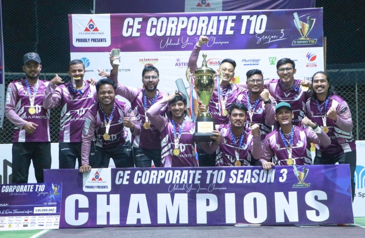 तेस्रो संस्करणको सीई कर्पोरेट टि–टेन इन्डोर क्रिकेट प्रतियोगिताको उपाधि क्लाउड फ्याक्ट्रीले जितेको छ । काठमाण्डौ बुढानिलकण्ठ, चुनिखेल स्थित रोयल स्पोट्र्स पार्कमा शनिवार राति सम्पन्न फाइनलमा क्लाउड फ्याक्ट्रीले रास्ट्रिय बाणिज्य बैंकलाई ५ विकेटले पराजित गर्दै उपाधि आफ्नो पक्षमा पार्यो । फाइनल...