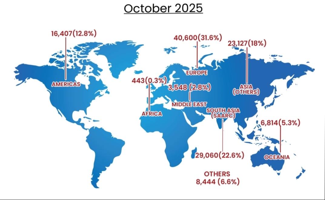काठमाडौँ। यसवर्षको पर्यटक आगमन अक्टोबर महिनामा मात्रै एक लाख २८ हजार ४४३ जना पर्यटकले नेपाल भ्रमण गरेका छन्। यो महिनालाई मुख्य पर्यटकीय समय मानिने भएकाले पर्यटकको आगमन उल्लेख्य देखिएको हो। नेपाल पर्यटन बोर्डले सार्वजनिक गरेको तथ्याङ्क अनुसार, गत जनवरीदेखि अक्टोबरसम्म...